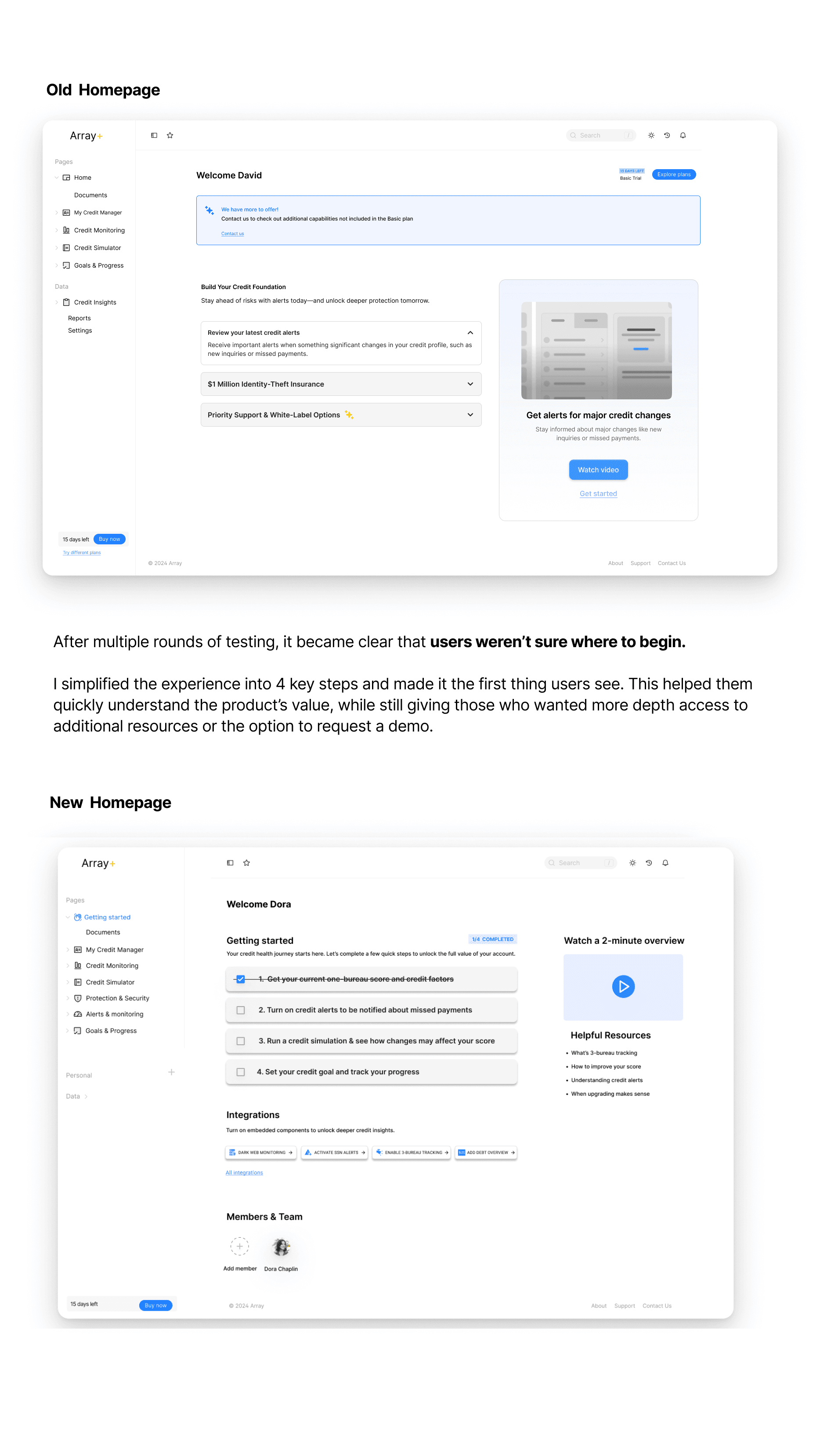 My main goal here was: Turn the Array “Home” page from a static info-view into an action-oriented onboarding dashboard that guides users toward completing key setup and tasks and also discovering high-value features.